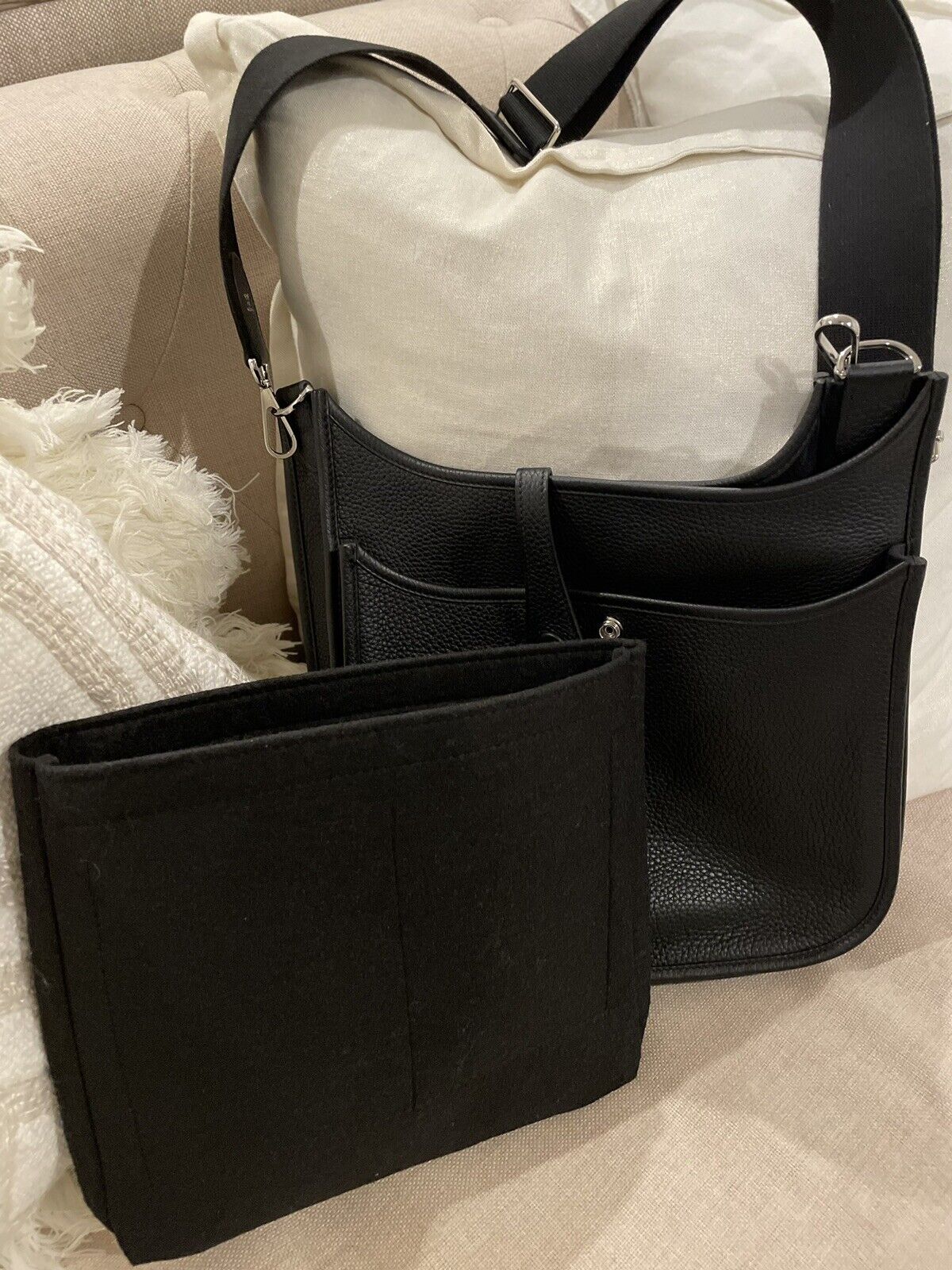 This Evelyne is in Black clemence leather with palladium hardware and has tonal stitching. pull tab top closure and Black removable canvas and leather shoulder/crossbody strap.