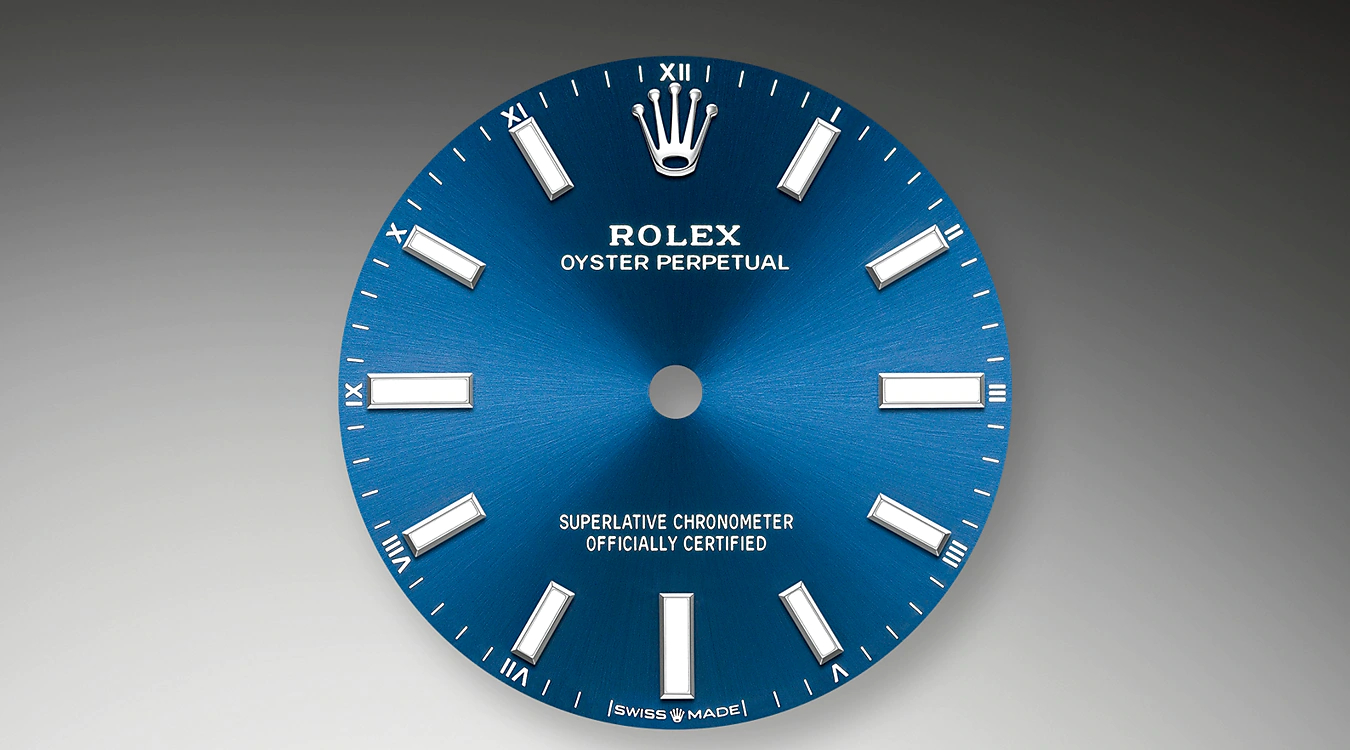 サンレイ仕上げは オイスター パーペチュアルコレクションの多くのダイアルに繊細な光の反射をもたらす。これはダイアルの中心から外側に向かって溝を作る 熟練のブラッシング技術によるものだ。光はそれぞれの彫りに沿って均一に拡散され 手首の位置に応じてわずかに動く 特徴的な輝きを生み出す。