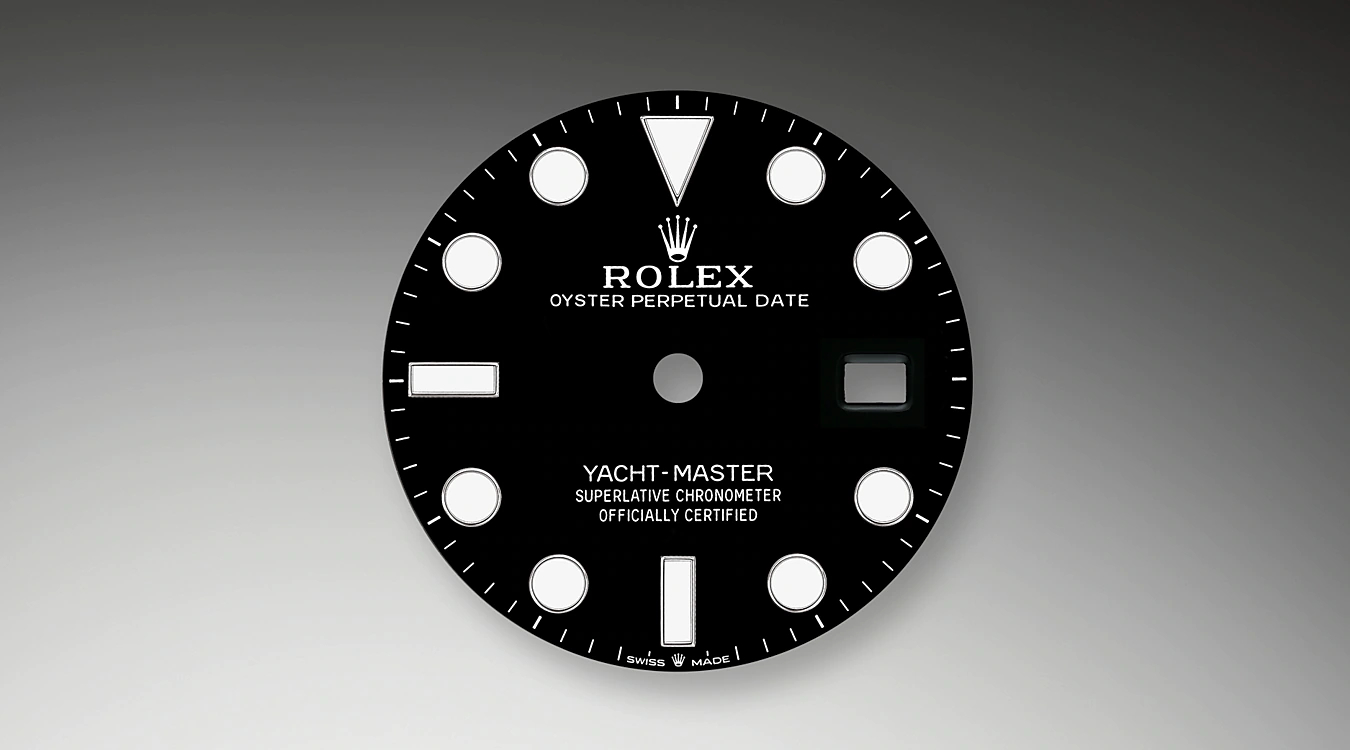 すべてのロレックス プロフェッショナルウォッチと同様に ヨットマスター 42はクロマライト ディスプレイにより どのような状況でも特に暗闇の中で優れた視認性を誇る。幅広の針と三角形 形 長方形といったシンプルな形のアワーマーカーには ブルーの光を放つ長時間継続の発光素材が採用されている。