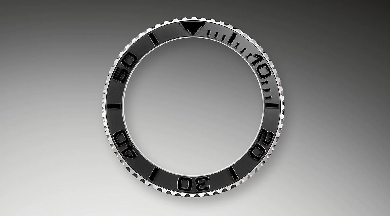 ヨットマスターの60分目盛り入り両方向回転ベゼルには希少な素材が使用されている。サンドブラスト仕上げのマット地に レイズド仕上げの数字と目盛りが際立つ。2つのブイの間のセーリング時間などが計測できる機能的なベゼルが このモデルの大きな個性となっている。